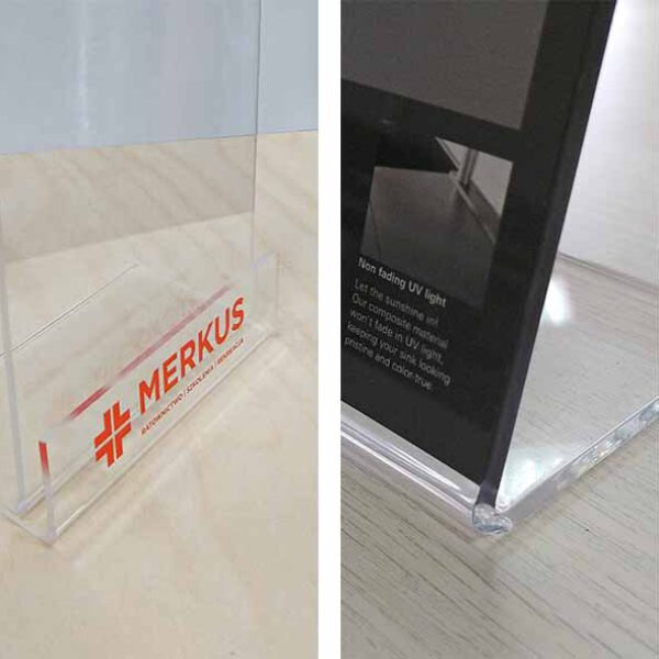 Plexiglas standees and displays are advertising forms that are designed to interest a potential buyer by presenting a promoted product or product line. Distinguished by one purpose and the richness of forms of signage on acrylic, it is a perfect solution for customers who are looking for an unusual way to distinguish their company or product. The available printing options include direct printing on acrylic or stickers printed on various types of film, which gives a wide range of personalisation possibilities. Printing on acrylic and other transparent substrates also allows the use of white printing, which increases the creative potential in design. It is worth emphasising that digital printing technology, including UV, ensures high print quality even with single runs, which makes this option very profitable for customers. It is also possible to make a display in the engraving technique.